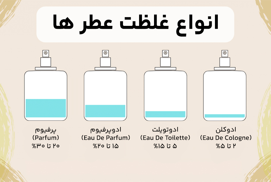 ادوپرفیوم (Eau de Parfum) دارای غلظت کمتری نسبت به عطر بوده و ماندگاری آن بین ۶ تا ۸ ساعت است، درحالیکه ادوتویلت (Eau de Toilette) سبکتر بوده و ۴ تا ۶ ساعت ماندگاری دارد. ادکلن (Eau de Cologne) کمترین میزان اسانس معطر را دارد و بیشتر برای استفاده روزانه و اسپری کردن روی بدن مناسب است. شناخت این تفاوتها کمک میکند تا بر اساس نیاز و سلیقه خود، انتخاب درستی داشته باشید